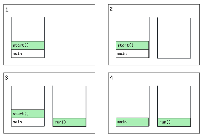 Thread의 start()는 JVM의 native 메서드를 호출하고, 이 메서드가 OS 수준에서 새로운 쓰레드의 새로운 호출 스택위에서 오버라이딩한 run() 메서드를 실행시켜줍니다.