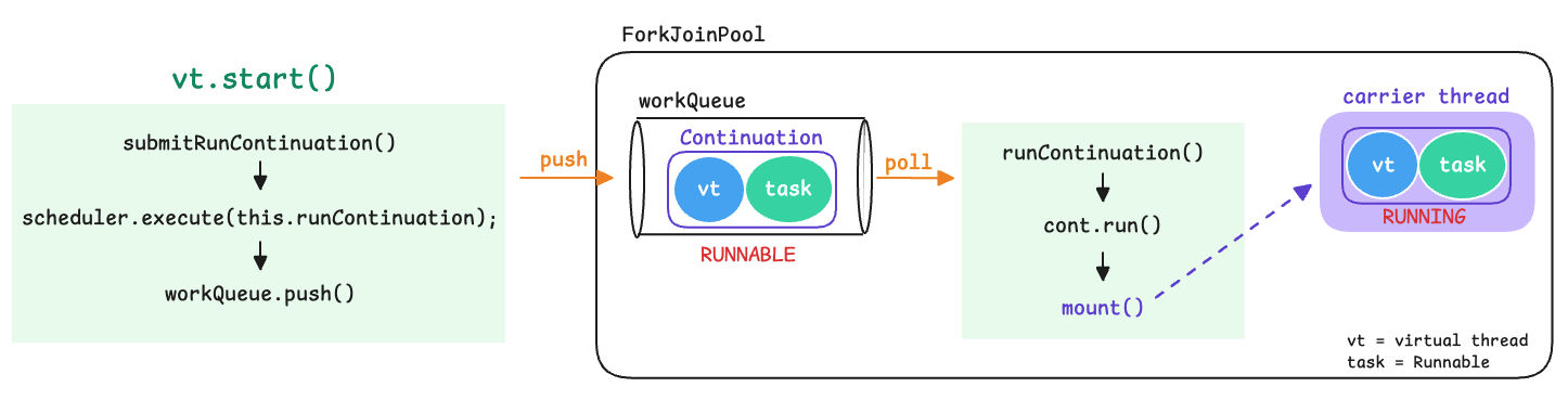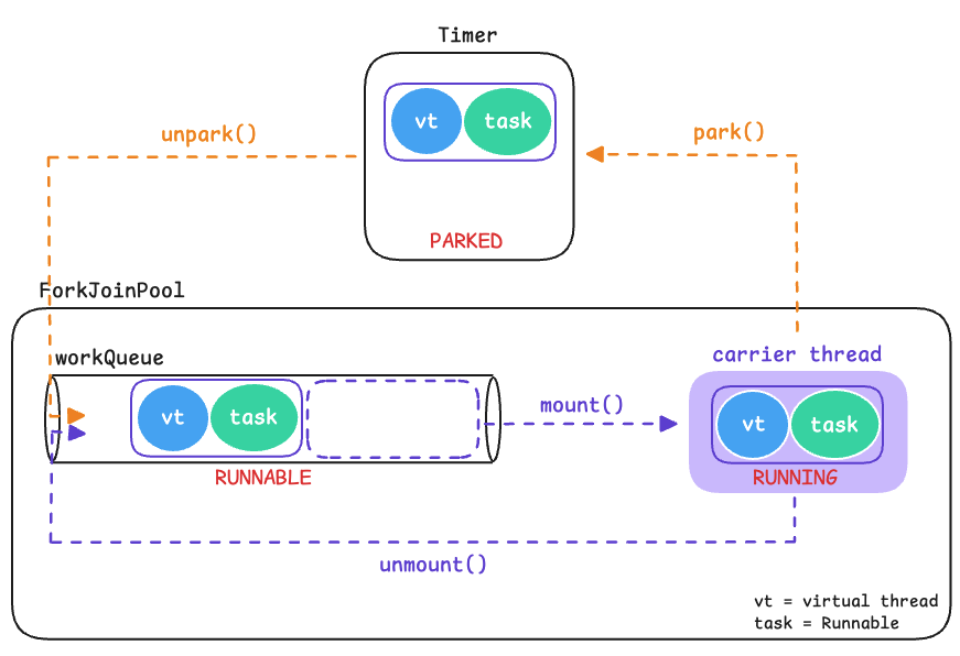 이처럼 가상 쓰레드가 도입되면서 기존 쓰레드와 다른 부분은 if문을 이용해서 가상 쓰레드일 때는 다르게 동작하도록 작성되었습니다. 가상 쓰레드의 구현 목표가 기존 쓰레드를 대체가 아닌, 기존 쓰레드를 최소한으로 변경하면서 새로운 기능인 가상 쓰레드를 추가하기 위한 것이었기 때문입니다.