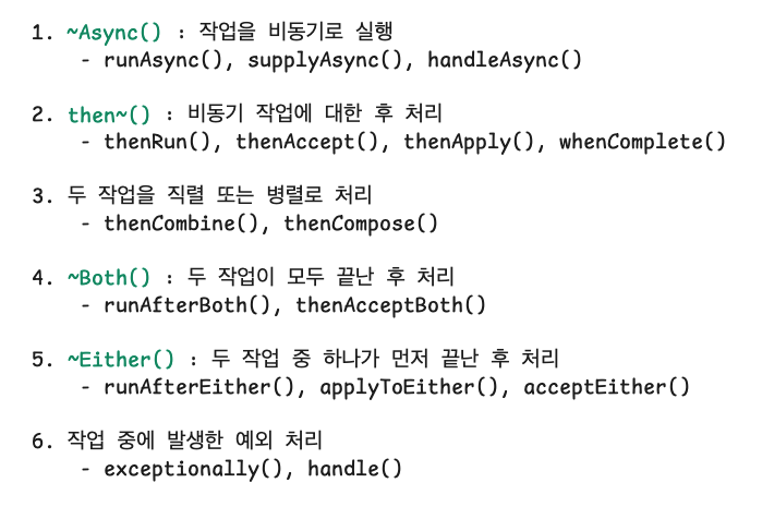 그리고 isDone(), isCancelled()만 있던 Future와 달리 isCompletedExceptionally()도 추가되었습니다.