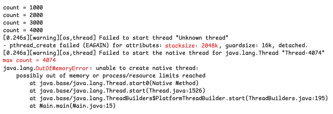 이 예제는 최대로 생성할 수 있는 플랫폼 쓰레드의 수를 알아내기 위한 것이었습니다. 실행 결과에서 일 수 있듯이, 4074개를 생성하고 시스템 제한으로 종료되었습니다. 쓰레드마다 할당되는 기본 호출 스택의 사이즈는 2048K(2M)인데, 이 값은 실행시 옵션으로 변경할 수 있으며 이 값을 줄이면 생성할 수 있는 쓰레드의 수가 늘어납니다.
