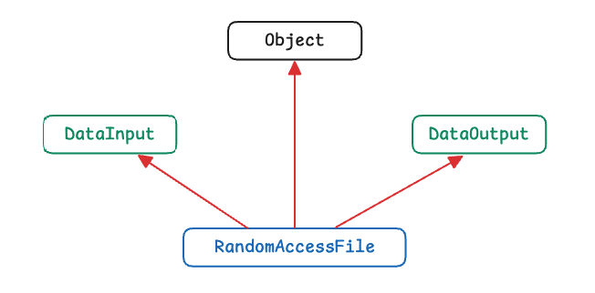 위 그림에서 알 수 있듯이, InputStream이나 OutputStream으로부터 상속받지 않고, DataInput인터페이스와 DataOutput인터페이스를 모두 구현했기 때문에 읽기와 쓰기가 모두 가능합니다. 그리고 DataInputStream과 DataOutputStream처럼 RandomAccessFile 또한 기본형 단위로 데이터를 읽고 쓸 수 있습니다.