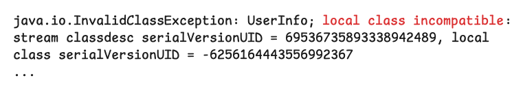 직렬화된 객체를 역직렬화할 때는 직렬화 했을 때와 같은 클래스를 사용해야 합니다. 그러나 클래스의 이름이 같더라도 클래스의 내용이 변경된 경우 역직렬화는 실패하여 다음과 같은 예외가 발생합니다.