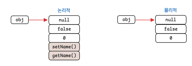 객체는 클래스에 정의된 인스턴스 변수의 집합입니다. 객체에는 클래스 변수나 메서드가 포함되지 않습니다. 객체는 오직 인스턴스 변수들로만 구성되어 있습니다. 객체를 생성하면 논리적으로 인스턴스 변수와 메서드가 함께 존재하지만, 객체의 실제 구현에는, 즉 물리적으로는 메서드가 포함되지 않습니다. 인스턴스 변수는 인스턴스마다 다른 값을 가질 수 있어야하기 때문에 별도의 메모리 공간이 필요하지만 메서드는 변하는 것이 아니라서 메모리를 낭비해 가면서 인스턴스마다 같은 내용의 코드(메서드)를 포함시킬 이유가 없기 때문입니다.